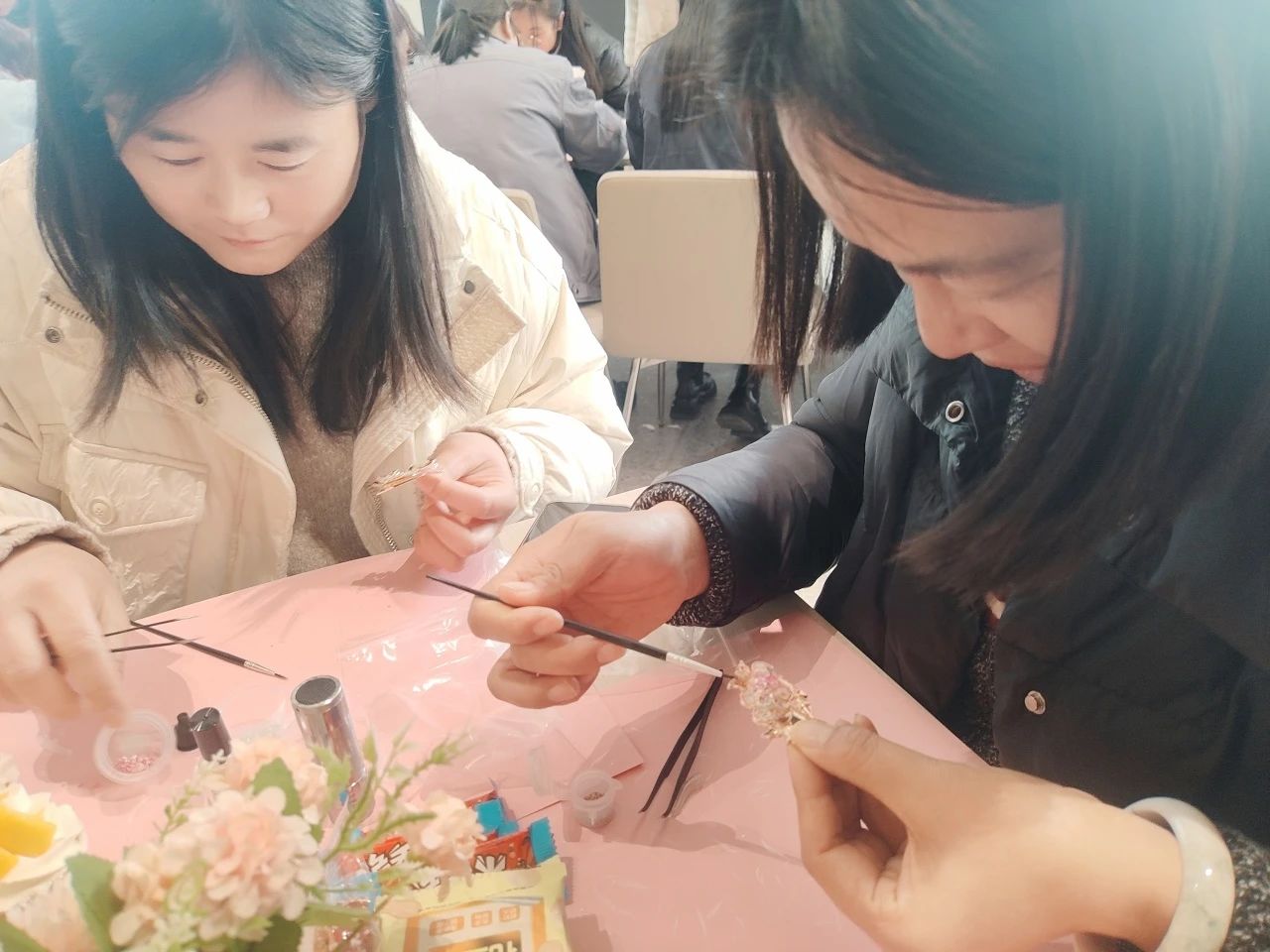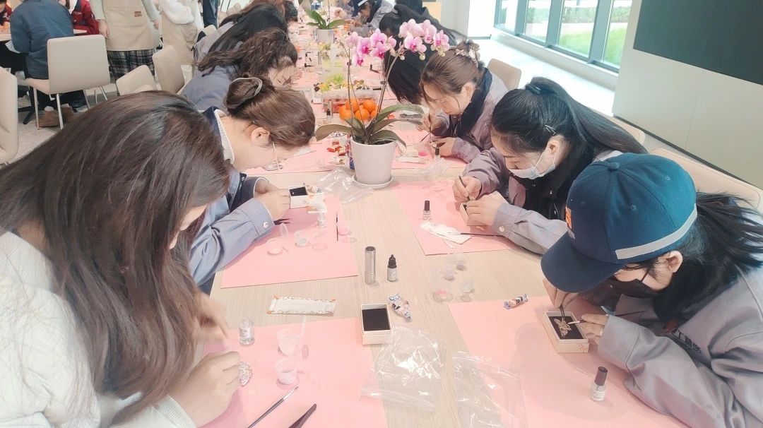 與此同時(shí),常熟分公司的非遺螺鈿胸針制作活動(dòng),將傳統(tǒng)技藝融入現(xiàn)代職場(chǎng)。螺鈿工藝傳承人現(xiàn)場(chǎng)講解千年技藝的歷史與精髓,女員工們化身“巧手匠人”,在貝母的流光中雕琢匠心:挑選螺片、設(shè)計(jì)紋樣、鑲嵌打磨……方寸之間,花鳥(niǎo)紋樣盡顯江南雅韻,幾何構(gòu)圖呼應(yīng)現(xiàn)代審美?;顒?dòng)不僅讓員工體驗(yàn)了非遺文化的魅力,更讓她們感受到公司對(duì)女性精神生活的重視。